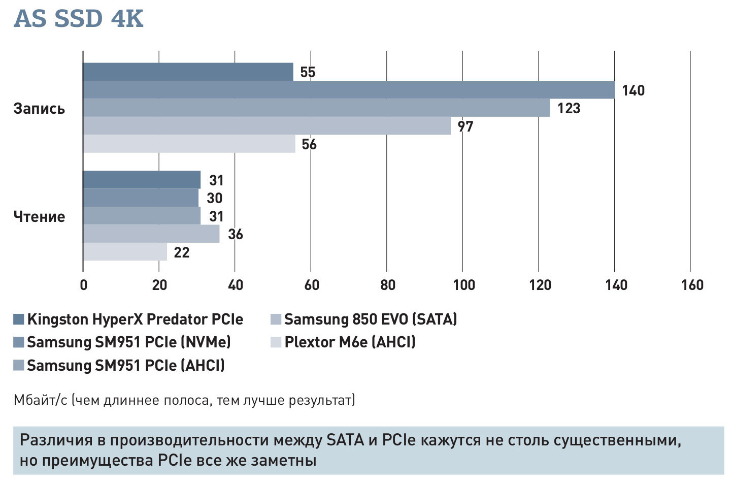 Как видно из диаграмм, результаты заметно различаются в зависимости от используемой технологии. Накопители PCIe имеют большое преимущество при выполнении операций последовательного чтения, что можно заметить при копировании больших файлов. Протокол NVMe доказал свое превосходство над AHCI при работе с небольшими файлами и множеством очередей (операции с блоками размером 4 Кбайт при использовании 64 потоков). Вероятность возникновения такого сценария зависит от вашей операционной системы и драйвера NVMe.
