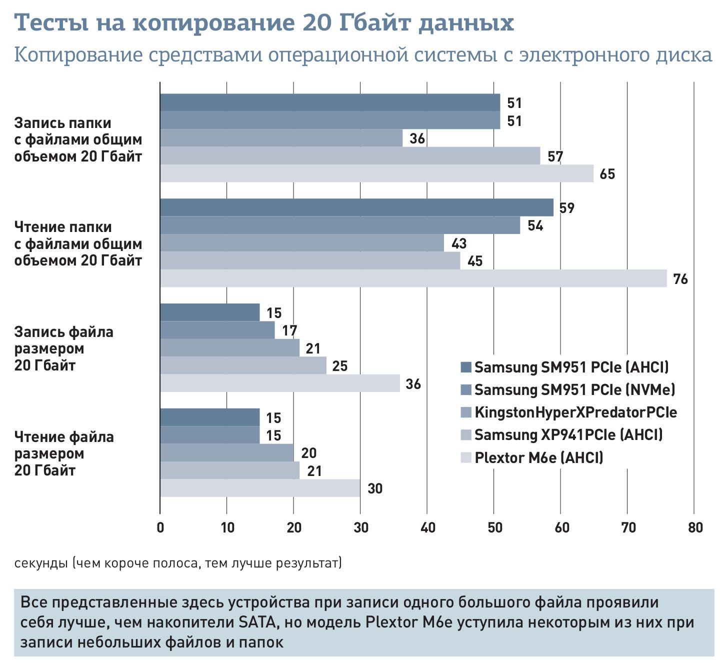 Ранее нам доводилось иметь дело только с устройствами Plextor, Kingston и XP941 AHCI, поэтому мы были приятно удивлены тем, что модель SM951 AHCI оказалась вполне конкурентоспособной по сравнению с NVMe. Кроме того, протестировав в реальной жизни обмен данными объемом 20 Гбайт, мы выяснили, что накопитель Kingston почти так же быстр, как и Samsung.