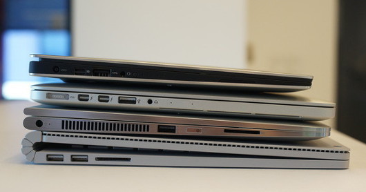 | Мы сложили ноутбуки друг на друга: сверху — Dell XPS 13, далее — Apple MacBook Pro 2015, HP Spectre X360 и в самом низу — Surface Book |