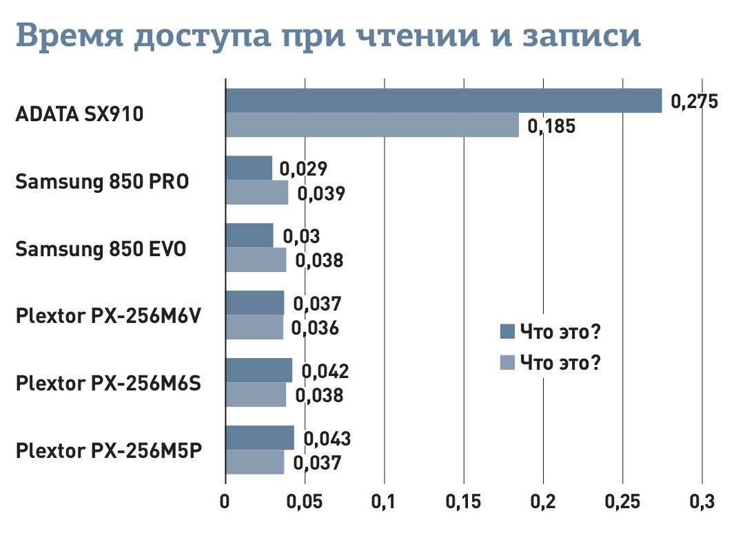 Даже при быстрой памяти накопитель на SF-2281 показывает крайне низкие результаты (чем меньше время доступа, тем лучше). Остальные SSD идут почти вровень по чтению, а по записи SSD производства Samsung всех опережают