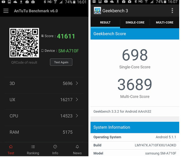 По мощности A7 немного обгоняет своего прошлогоднего собрата, как и положено новинке. По производительности его можно сравнить с ASUS ZenFone с 2, оснащенным процессором Intel, или с Sony Xperia Z3 с на базе Qualcomm Snapdragon 801. Игры идут с хорошей частотой кадров, ниже 30 fps ничего не проседает, система работает шустро. Добавлю еще, что смартфон понравился качественным звуком в наушниках и громким динамиком.