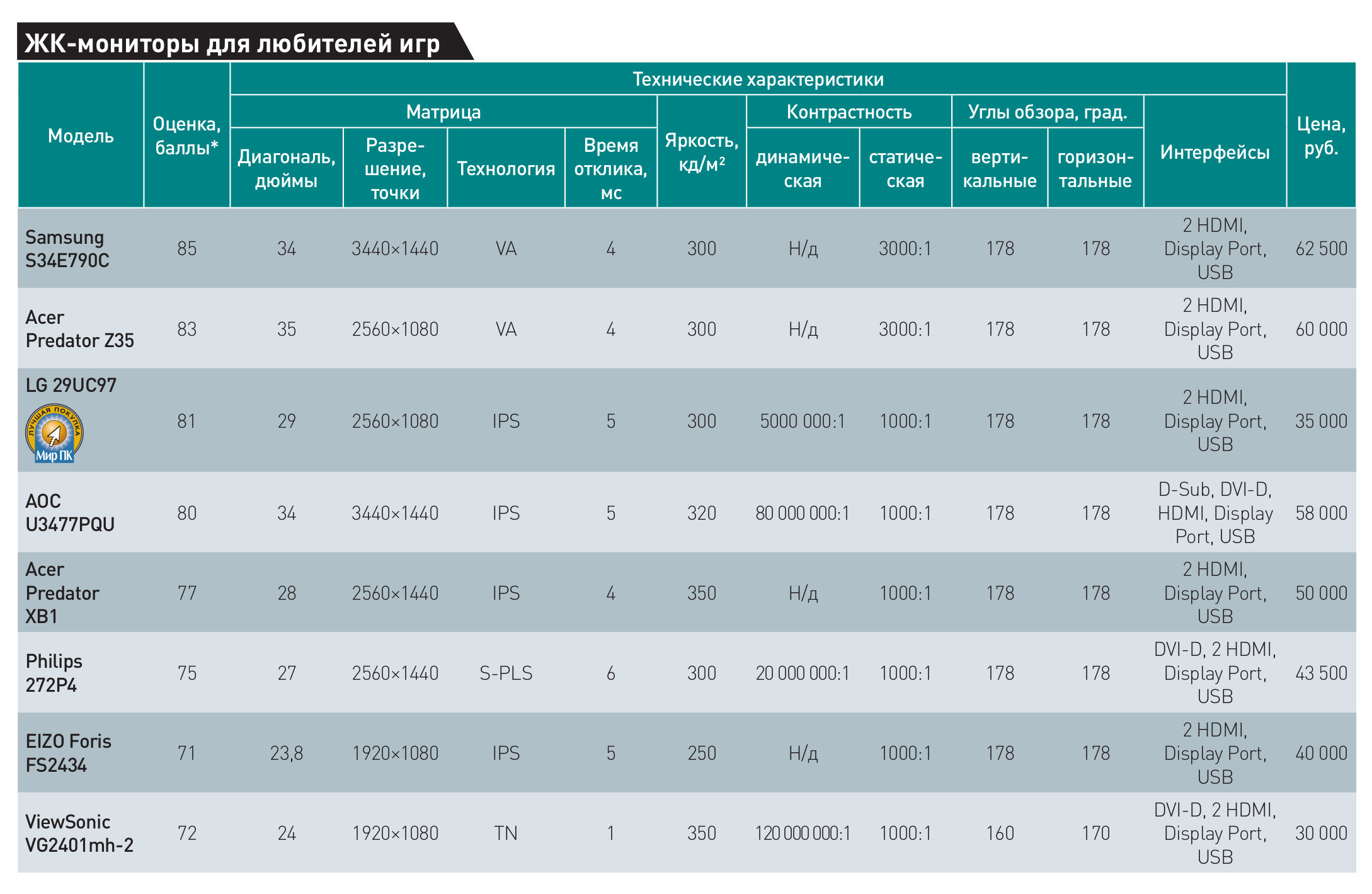 Если год назад в наших обзорах игровых мониторов фигурировали в основном модели, оснащенные TN-матрицами, то сейчас ситуация изменилась. На сцену вышли IPS (PLS) и VA устройства. Как показывает практика, пользователь не готов платить только за быструю матрицу, ему нужно еще и качественное изображение, и хорошие углы обзора. Выбирая среди представленных аппаратов, мы хотели бы остановиться на модели LG 29UC97, которая имеет привлекательный дизайн и обеспечивает сравнительно качественное изображение при относительно доступной цене на фоне конкурентных аппаратов других производителей. Она может стать хорошим вариантом для любителя игр, и потому заслуженно получает значок «Лучшая покупка».