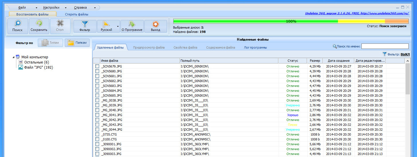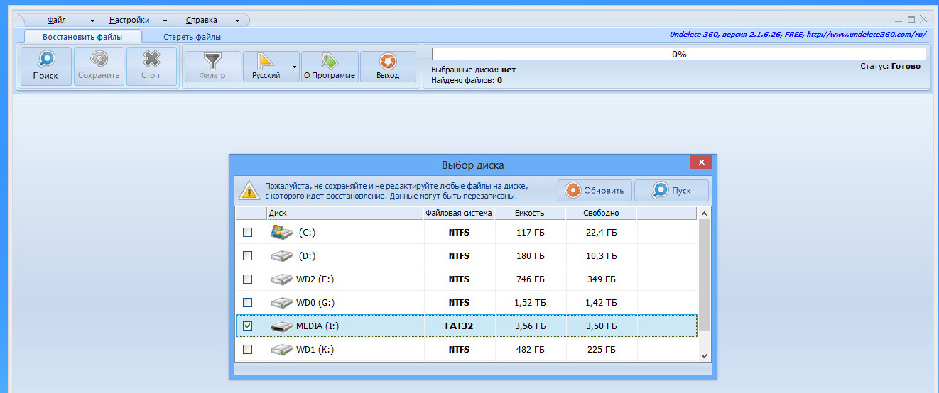 Если же платный вариант программы восстановления данных чем-то не устраивает, всегда можно воспользоваться одним из бесплатных, которых довольно много. Но далеко не все из них достойны внимания. На мой взгляд, неплохим вариантом может стать ПО Undelete 360 (http://www.undelete360.com/ru/index.html). Программа объемом около 2 Мбайт позволяет работать с картами памяти, флешками и жесткими дисками. Интерфейс русифицирован. Поддерживаются как 32-,так и 64-разрядные ОС семейства Windows. К недостаткам этого варианта относится более скромная функциональность. Однако в работе данная утилита довольно удобна, и к тому же она успешно справляется с возложенными на нее обязанностями.
