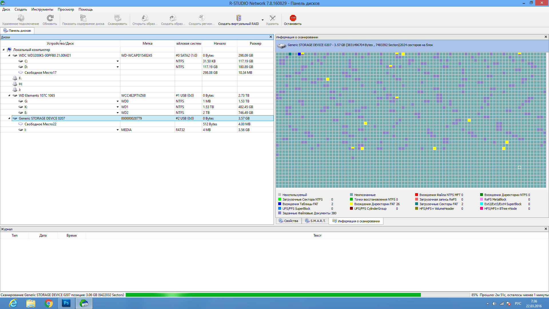 | Подтверждая выбор, запускаем процесс сканирования. Он отображается в привычном графическом виде в правой и нижней частях экрана |