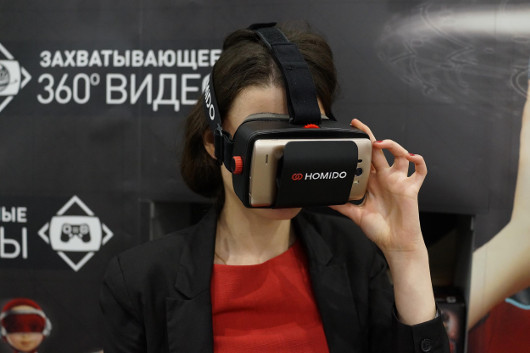 Не забыта была и тема объемного видео, Хотя и раскрывалась она весьма витиевато. На одном из стендов демонстрировался шлем, работающий в паре со смартфоном. Для демонстрации 3D нужно установить на мобильное устройство приложение, которое выводит на свой экран две картинки — для левого и правого глаза. Смартфон устанавливается в специальный паз, а увеличенное изображение с него можно наблюдать через обычные оптические окуляры |