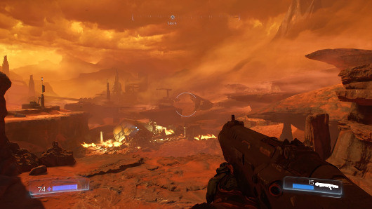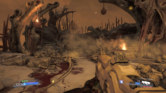 В игре мы много бродим по замкнутым пространствам, но для перестрелок нам обязательно предоставляют большую локацию. DOOM не использует принцип «беги и стреляй». Противников не бывает мало, и если они уж появляются, то численность их не менее нескольких десятков. На этом фоне странным кажется довольно малое количество патронов — не сказать, что припасов не хватает, но весьма часто нужно следить за боезапасом и не расходовать заряды напрасно. А когда становится совсем худо, наступает черед бензопилы — она удалась на славу. Красные брызги во все стороны, разрезанные тела, измазанная кровью цепь — живущий внутри игрока садист точно останется доволен. Появившееся в игре добивание противников, кстати, используется постоянно: из врагов выпадают небольшие аптечки, позволяющие быстро поправить здоровье. Фаталити не отнимают много времени, они отлично подошли к скоростному геймплею и не замедляют его.