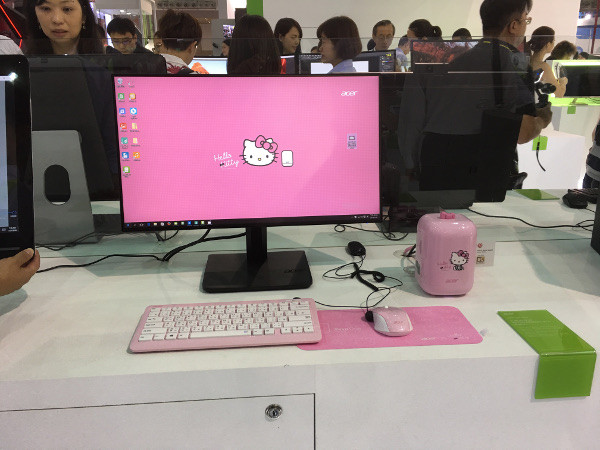 А вот Acer порадовала линейкой брендированной техники. Ноутбуки, десктопы, мониторы, мыши и клавиатуры — все в цветах и в стилистике Hello Kitty. В Россию нечто подобное тоже приедет, но, скорее всего, оформление будет иным, например, Машей и медведем из популярного детского мультфильма.