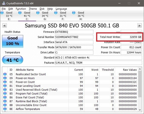 | ОCrystal Disk Info также показывает, сколько данных было записано на SSD |