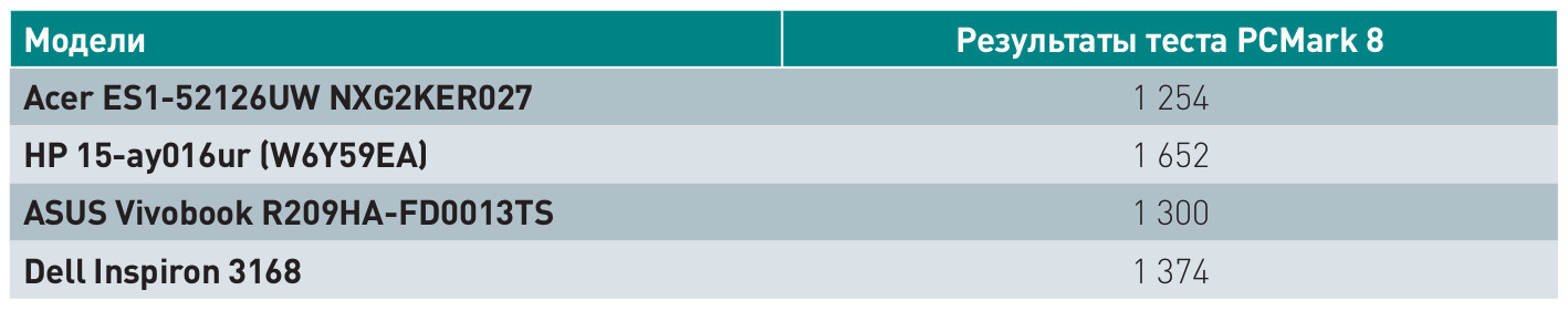 В сводной таблице ниже наглядно представлены результаты теста PCMark 8 в режиме Home для всех рассматриваемых в нашем материале ноутбуков.