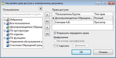 Теперь пользователи, обладающие полными правами на документ, могут разрешить другим пользователям передавать свои права доступа. Например, пользователи с правами на изменение могут назначать права другим пользователям на просмотр и изменение документа. Эта возможность помогает гибко управлять правами доступа в крупных организациях, где нельзя изначально четко назначать права доступа на документ.