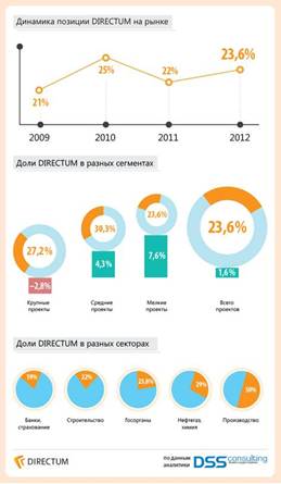 Наши клиенты – это крупные и средние компании. Поэтому лидерство в этом сегменте – одна из важных задач, которую мы планомерно реализуем. Рады сообщить, что аналитический обзор российского рынка ECM-продуктов за 2012 год от DSS Consulting показывает, что компания DIRECTUM в очередной раз подтверждает стратегическое лидерство в сегменте крупных проектов, реализовав 27,2% из них. DIRECTUM сохраняет стратегическое лидерство в сегменте крупных проектов с 2008 года, то есть на протяжении 5 лет. В сегменте средних проектов DIRECTUM не только остался продуктом номер один с 30,3% рынка, но и увеличил отрыв от конкурентов – три оставшихся популярных в данном сегменте ECM-продукта потеряли 4,9%.