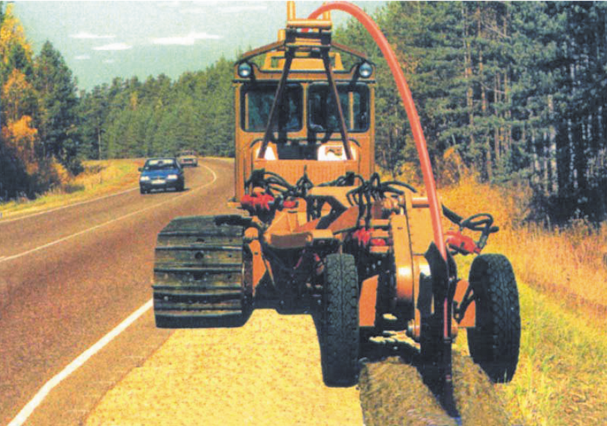 | Вдоль дорог. Технология транспортной многоканальной коммуникации (ТМК) предполагает прокладку в зоне землеотвода автодорог кабельной канализации из 4–6 пластиковых труб, в которые затем задувается оптический кабель. |