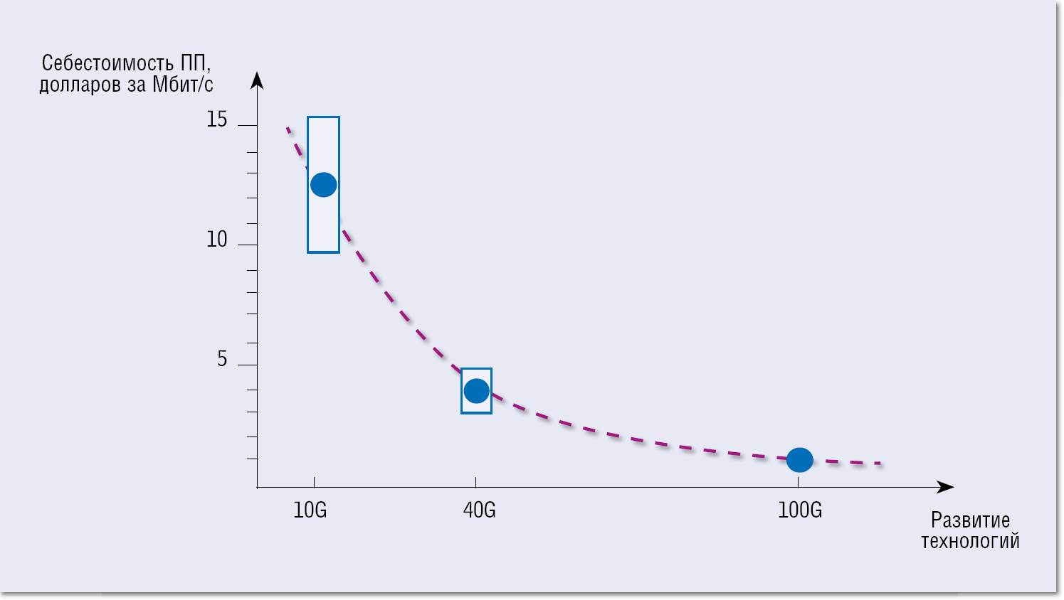 По мнению аналитиков Yankee Group, именно цена является определяющим фактором при выборе поставщика телекоммуникационной емкости. И только потом во внимание принимаются другие факторы: география покрытия, качество услуги и условия для заключения соглашений SLA, оперативность предоставления услуги, используемая технология. Правда, следует заметить, что технология во многом определяет возможность снижения стоимости пропускной способности (см. Рисунок 1). Согласно расчетам, о которых сообщил Виталий Шуб, переход на системы 100G может привести к снижению себестоимости передачи 1 Мбит/с до 1 доллара и менее. По его мнению, в ближайшие годы технологические инновации станут новым полем конкурентной борьбы в магистральном бизнесе, а преодоление долларового порога способно существенно изменить структуру и дальнейшее развитие рынка.