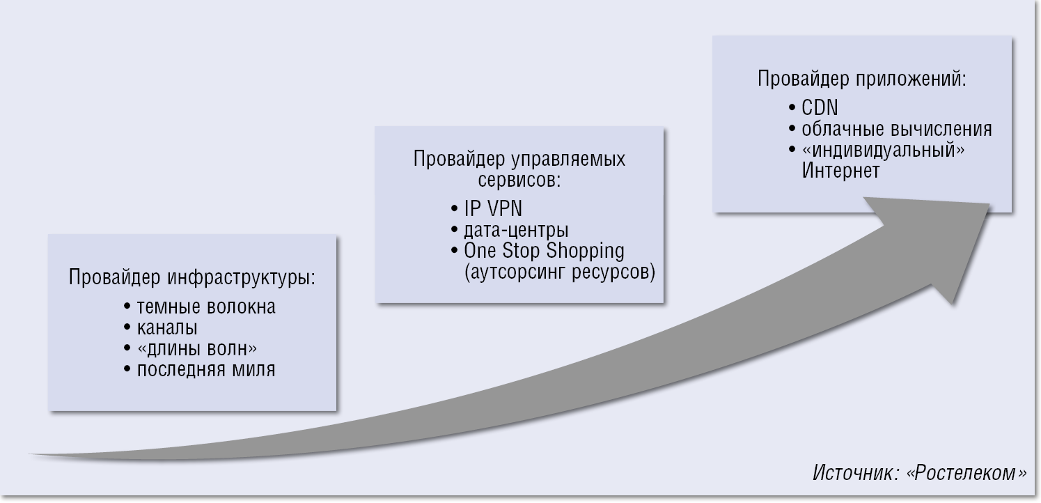 Говоря о планах «Ростелекома», в недалеком прошлом монополиста на рынке магистральной связи (собственно, тогда и рынка как такового не было), Евгений Секерин, директор департамента продаж операторам, акцентировал внимание на эволюционном преобразовании инфраструктурного оператора, постепенно превращающегося в универсального поставщика услуг (см. Рисунок 2). Уже сегодня, помимо каналов, темных волокон и «длин волн», «Ростелеком» выступает как «провайдер управляемых сервисов», к которым в компании относят услуги IP VPN и ЦОД. В перспективе компания намерена стать и «провайдером приложений», планируя предоставлять услуги облачных вычислений, сетей доставки контента (CDN) и др. Руководство «Ростелекома» считает, что трансформация бизнеса с целью увеличения ценности услуг для потребителя — это основа для сохранения инфраструктурным оператором своей доли рынка.