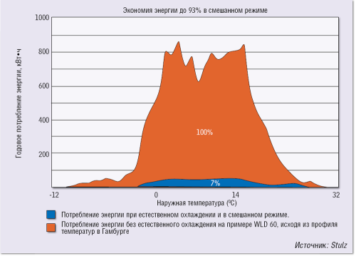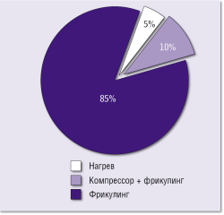 Насколько эффективен фрикулинг? Компания Stulz приводит данные по потреблению электроэнергии кондиционерами с функцией фрикулинга и без таковой, исходя из профиля температур в Гамбурге. И для аппарата наружного монтажа, и для кондиционера, монтируемого внутри контейнера, цифры экономии одинаковы — до 93% (см. Рисунок 3). Данные компании «ВентСпецСтрой», собранные по результатом эксплуатации ее кондиционеров «Мистраль-телеком» на базовых станциях сотовой связи, развернутых в Московской области, показывают, что только в течение 10% времени работы к режиму естественного охлаждения требовалось подключать еще и компрессорный цикл охлаждения, а большую часть времени (85%) фрикулинга было вполне достаточно (см. Рисунок 4).