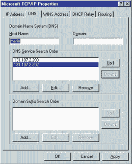 Если клиент, который вы конфигурируете, должен предоставлять ресурсы внешним пользователям, вам придется также добавить имя домена в диалоговое окно, показанное на Экране 2. Отметим, что эта запись представляет собой имя домена Internet, а не имя домена NT. Обычно, вы можете оставить это диалоговое окно пустым. После того, как вы закончили конфигурацию TCP/IP, перезагрузите свой компьютер.
