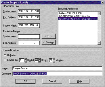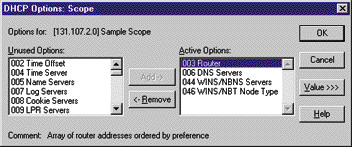 При выходе из диалога Create Scope возможно появление сообщения об ошибке No more data is available. Его можно проигнорировать. Созданный диапазон появится в окне DHCP Manager. Если вы его активизировали, изображенная справа от него лампочка будет гореть желтым цветом. Не волнуйтесь, если вы ввели диапазон 131.107.2.100-131.107.2.199, а в окне DHCP Manager появилось 131.107.2.0. Просто DHCP показывает последние восемь адресов, как ноль.