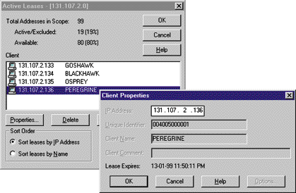 DHCP позволяет легко определить, какой машине какой адрес назначен. В диалоге DHCP Manager (показанном на экране 1), выберите Scope, затем Active Leases. Для получения подробной информации о сроке аренды адреса для каждой из машин, выберите ее и нажмите Properties (или два раза щелкните на имени машины). На экране 4 показан список компьютеров моей офисной сети. Уникальный идентификатор (например, 004005000001) — это MAC-адрес сетевой платы. При необходимости отключить компьютер от сети, или после того как одна из машин была из нее удалена, соответствующий срок аренды можно аннулировать.