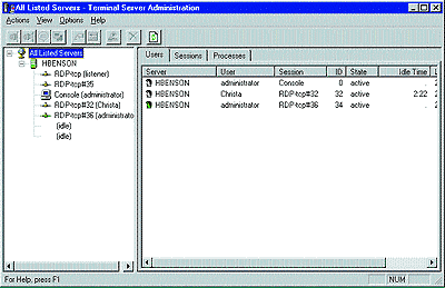 Вы управляете соединениями Terminal Server с помощью инструментария Terminal Server Administration, показанного на экране 3. Terminal Server Administration позволяет просматривать все текущие сеансы, передавать сообщения конкретного сеанса, отключать сеансы и выбирать их для маскировки (если вы используете MetaFrame). Кроме того, утилита предоставляет список всех процессов, запускаемых в рамках каждого сеанса.