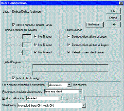 Имеющееся в Terminal Server приложение User Manager for Domains поддерживает свойства учетной записи пользователя, которыми не обладают утилиты User Manager в NT. Вы можете воспользоваться этими дополнительными свойствами, нажав на кнопку Config в таблице User Properties данной учетной записи. Эти специфические для Terminal Server свойства, показанные на экране 2, позволяют определить, может ли данная пользовательская учетная запись установить соединение к системам Terminal Server вашей сети (по умолчанию Terminal Server могут использовать все бюджеты), как Terminal Server обрабатывает время прерывания соединения и являются ли сетевые соединения постоянными. Таблица свойств User Configuration также позволяет сконфигурировать параметры маскировки сеансов, но эти установки не будут доступны до тех пор, пока вы не запустите MetaFrame. (По умолчанию Terminal Server этот вариант не отключает; это может ввести в заблуждение администраторов Terminal Server, которые не знают, что данная версия Terminal Server не поддерживает маскировку без MetaFrame.)