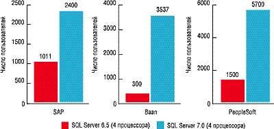 Проведенное Microsoft тестирование SQL Server 7.0 Enterprise Edition с применением процедур измерения производительности нескольких ERP-систем показало значительный прирост производительности по сравнению с предыдущей версией при работе на 4-процессорных системах. Результаты представлены на Рисунке 1. Несомненно, новая архитектура проявит себя и на системах с большим числом процессоров; на новых 8-процессорных серверах показатели, приведенные на Рисунке 1, наверняка будут многократно перекрыты.