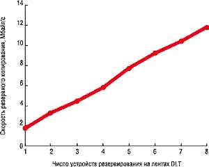 В основе Рисунка 3 лежат результаты тестирования, проведенного Microsoft, Legato Systems и Compaq. Тесты выполнялись для базы данных размером 263 Гбайт на 8-процессорном сервере Compaq AlphaServer оперативной памятью объемом с 8 Гбайт, 2,2 Тбайт дискового пространства и 32 ленточными накопителями Compaq AIT. Как показывает Рисунок 3, скорость копирования растет пропорционально количеству ленточных накопителей.