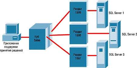 Куб реализует логическую структуру данных, размещенных в хранилище, однако сами данные хранятся в разделах. Каждый куб должен иметь хотя бы один раздел. В SQL Server 7.0 Enterprise Edition можно создавать дополнительные разделы, позволяющие распределять куб между несколькими источникам данных на разных серверах. Этот подход значительно улучшает масштабируемость, поскольку в результате OLAP-служба могут работать на кластере. На Рисунке 4 показано, как можно распределить разделы по нескольким источникам данных. Для системы поддержки принятия решений такой куб OLAP представляет собой единое целое, но на самом деле он размещен в трех разделах.
