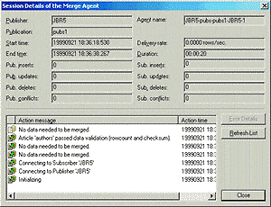 Наиболее серьезные проблемы с репликацией возникают в SQL Server тогда, когда нарушается синхронность данных издателя и подписчиков. Пользователи могут получить недостоверные данные, или может произойти сбой репликации из-за отсутствия синхронизации данных. Например, не исключена вероятность отказа агента распространителя, в результате чего появится ошибка ключа дубликата. Теперь, когда вы познакомились с возможностями проверки достоверности данных репликаций, предоставляемыми SQL Server 7.0, вы сами сможете обнаружить нарушения синхронизации данных до того, как они превратят в хаос всю систему.