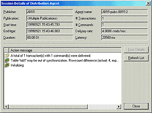 Для просмотра результатов проверки достоверности понадобится запустить агентов распространения и программу чтения журнала, а также заглянуть в журнал истории агентов распространения. На Экране 1 показано сообщение о нарушении синхронизации в таком журнале. Заметим, что при запуске sp_publication_validation из окна запросов на экране появится сообщение о том, что для таблицы сгенерировано значение числа строк, равное 3. Не стоит обращать на него внимания. Это побочный продукт механизма проверки достоверности, который создается в процессе исполнения процедуры sp_table_validation у издателя. Это сообщение не показывает, успешно или неуспешно закончилась проверка достоверности у подписчика.