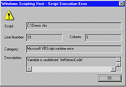 Использовать директиву On Error Resume Next для обработки ошибок очень полезно. Допустим, я закомментирую строку (т. е. добавлю в ее начало Rem), определяющую переменную intReturnCode в начале demo.vbs: