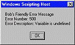 Если я запущу свой сценарий, он выполнится до конца, но желаемый результат, возможно, достигнут не будет. Вместо стандартного сообщения WSH об ошибке периода исполнения сценарий выдаст изображенное на Экране 2 диалоговое окно с сообщением о неопределенной переменной. Конструкция If-Then-End If в блоке В Листинга 1 представляет собой примитивную подпрограмму обработки ошибок, отображающую в диалоговом окне значения свойств Number и Description объекта VBScript.Err. После того как пользователь нажмет на клавишу ОK в диалоговом окне с информацией об ошибке, выполнение сценария продолжится, потому что он содержит директиву On Error Resume Next. Если ее закомментировать, то вместо моего диалога при запуске сценария будет выведено окно WSH с сообщением об ошибке, показанное на Экране 1. Единственный довод в пользу отказа от директивы On Error Resume Next состоит в том, что информация в окне WSH Scripting Host Execution Error может быть более подробной, чем в свойствах объекта Err. В окне на Экране 1 выведены не только имя неопределенной переменной, но и номер строки, в которой возникли ошибки. Диалог, показанный на Экране 2, лишь сообщает о попытке использования неопределенной переменной.