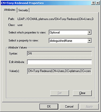 Утилита AdsiEdit из комплекта Microsoft Windows 2000 Resource Kit позволяет просмотреть и DN объекта пользователь в AD, что показано на Экране 1.