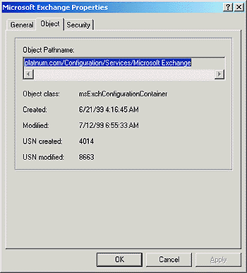 На Экране 4 показаны свойства контейнера AD, содержащие детали настройки сервера Exchange. Каждый объект в AD имеет DN-имя. Контейнер с именем domain/configuration/services/microsoft exchange содержит несколько других контейнеров, где хранится подробная информация о группах маршрутизации и администрирования, списках адресов и коннекторах. Этот контейнер реплицируется по всем контроллерам леса, что позволяет всем серверам Exchange в организации иметь доступ к информации в нем. Похожая информация в Exchange Server 5.5 хранится в контейнере Directory Store.