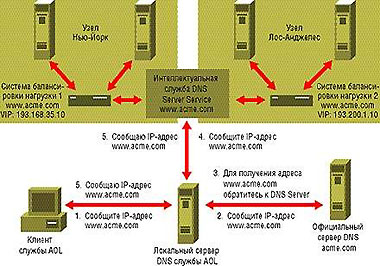 Чтобы лучше понять механизм данного процесса, вернемся к нашему примеру. Виртуальная система с именем www.acme.com представлена на двух сайтах. Функции серверов DNS для этой машины выполняют две системы балансировки нагрузки: одна — в Нью-Йорке, вторая — в Лос-Анджелесе. Разрешение имен для таких служб, как ftp и электронная почта, а также для других серверов и компьютеров в Internet осуществляется официальным сервером DNS домена acme.com. Так вот, администратор может делегировать имя поддомена www.acme.com, который является частью Internet-домена acme.com, обоим средствам балансировки, после чего обе системы выравнивания нагрузки станут серверами имен для поддомена www.acme.com. Чтобы получить подобную конфигурацию, нужно для каждой системы балансировки определить DNS-имя www.acme.com и поставить его в соответствии с ее собственным локальным VIP-адресом. Поскольку две системы балансировки обмениваются информацией о конфигурации и нагрузке, обе они «понимают», что виртуальная система www.acme.com имеет два VIP-адреса (т. е. представлена двумя узлами). И следовательно, обе имеют информацию о нагрузке и доступности каждого из сайтов.