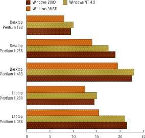 | РИСУНОК 1. В конфигурации с объемом памяти 64 Мбайт, Windows 2000 Professional существенно быстрее, чем Windows 98 и сравнима по производительности с Windows NT Workstation 4.0. (Чем выше значение, тем лучше.) |