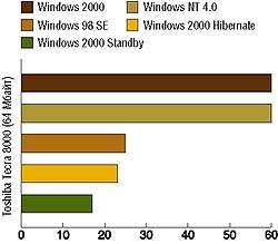 | РИСУНОК 3. На графике показано время с момента запуска системы до начала регистрации в домене. В процессе «холодной» загрузки, в «спящем» состоянии (standby) и в режиме ожидания Windows 2000 обеспечивает приемлемые показатели. (Чем ниже значение, тем лучше.) |