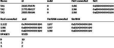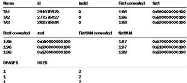 Проверим, где расположена первая страница каждой таблицы и сколько места выделено и используется в таблице TA1. Вспомним, что поле FIRST — это первая страница, ROOT — последняя, FIRSTIAM — первая страница в списке IAM-страниц, индексных карт размещения.