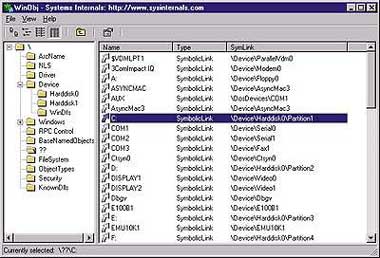 Интерфейс Win32 API не имеет представления о пространстве имен NT Object Manager. NT резервирует пару разных подкаталогов в пространстве имен для использования Win32 и именует один из них как ??. В этом подкаталоге NT делает доступными объекты устройств, с которыми взаимодействуют приложения Win32, включая COM и параллельные порты, а также диски. Поскольку объекты диска реально размещены в других каталогах, NT применяет символические ссылки для связи объектов, расположенных внутри каталога ??, с объектами, расположенными где-либо еще в пространстве имен. Для каждого физического диска системы I/O Manager создает ссылку ??PhysicalDriveX, которая указывает на deviceharddiskXpartition0 (Х заменяют на номер, начиная от 0). Приложения Win32, работающие с секторами диска напрямую, открывают диск, указывая имя \.PhysicalDriveX (где Х - номер диска) и вызывая Win32 CreateFile. На уровне приложений Win32 имя конвертируется в ??PhysicalDriveX, перед тем как будет передано NT Object Manager.