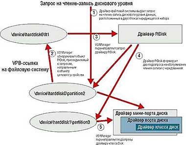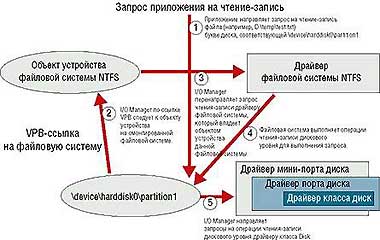 Когда бы драйвер устройства или приложение ни послали запрос на чтение-запись объекту устройства, менеджер NT I/O Manager перенаправляет его (в виде программного пакета с запросом на чтение-запись - I/O request Packet, IRP) тому драйверу устройства, который создал данный объект. Так, перед тем, как послать запрос на чтение загрузочный сектор на втором разделе harddisk0, приложение сначала открывает объект deviceharddisk0partition2, затем посылает ему запрос на чтение 512 байт, начиная со смещения 0. NT I/O Manager перенаправляет запрос приложения драйверу класса Disk, сообщая, что IRP предназначен для объекта partition2. Поскольку разделы есть не более чем логические представления, применяемые в NT для доступа к непрерывным зонам на физическом диске, драйвер класса должен перевести смещения, которые отсчитываются относительно раздела, в смещения, отсчитываемые от начала диска. Если partition2 начинается с сектора диска №4096, драйверу класса следует подстроить параметры IRP и задать именно этот номер как смещение, прежде чем пересылать запрос драйверу мини-порта. Драйвер мини-порта выполняет операции чтения-записи на физическом диске и возвращает запрошенные данные в буфер приложения, указанного в IRP.