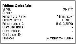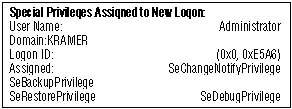 Некоторые привилегии свойственны только объектам. Так, например, привилегированная операция с объектом SeSecurityPrivilege выполняется каждый раз, когда с помощью программы Event Viewer открывается журнал безопасности. При работе с любым привилегированным объектом записывается событие №578, которое фиксирует все использованные привилегии.