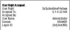 Когда администратор с помощью User Manager наделяет какого-либо пользователя некоторыми полномочиями, Windows NT записывает событие №608 (см. Рисунок 4). Это событие сохраняет вид полномочия и того пользователя, которому оно предоставлено. В соответствующих полях хранится вся информация об администраторе, предоставившем данное полномочие, - его имя, домен и номер сеанса. Номер сеанса администратора позволяет встроить подобное событие в цепочку действий в конкретном сеансе работы администратора в системе. При аннулировании полномочий пользователя записывается событие №609, сохраняющее такую же информацию, как и событие №608. Не следует путать события №608 и №609 с событиями из категории аудита привилегий. Описанные ранее события №576, №577 и №578 фиксируют случаи реального использования полномочий пользователями, за исключением администраторов и операторов учетных записей.