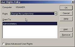 Данная категория позволяет проследить, как сотрудники на деле используют свои полномочия. В терминологии Windows NT слова «привилегия» (privilege) и «полномочие» (right) имеют разные значения. Изменять полномочия пользователя можно в диалоговом окне настройки политики прав пользователя (см. Экран 1), которое вызывается через User Rights Policy из меню Policies программы User Manager, находящейся в группе Administrative Tools.