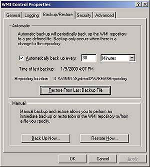 С помощью snap-in-модуля WMI Control в Microsoft Management Console (MMC) можно изменять параметры резервного копирования, восстанавливать данные с резервной копии, управлять поведением WMI и другими свойствами репозитария. Чтобы открыть модуль WMI Control, нужно нажать правой кнопкой мыши на иконке My Computer и выбрать Manage в ниспадающем меню или воспользоваться элементом Computer Management из папки Administrative Tools. Раскрыв узел Services and Applications, следует нажать правой кнопкой на меню WMI Control, а затем Properties. На Экране 2 показана панель Backup/Restore, с помощью которой можно управлять процессами резервирования и восстановления.