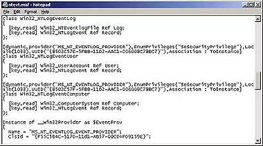 | Экран 1. Просмотр в Notepad файла ntevt.mof с классами событий. |