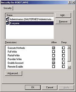 В WMI определены средства ограничения доступа к пространству имен, причем сделано это так же, как и в Windows 2000. Выбрав закладку Security в окне WMI Control Properties, можно сконфигурировать параметры обеспечения безопасности. На Экране 4 показан диалог настройки параметров безопасности раздела ootWMI пространства имен WMI.