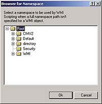 В каталоге \%systemroot%system32wbem системы Windows 2000 находится приложение wbemtest.exe, с помощью которого осуществляется подключение и перемещение по пространству имен WMI. Нажав кнопку Connect в меню программы wbemtest.exe, можно получить доступ к определенной части пространства имен (например, rootCIMV2) на локальном или удаленном компьютере. После подключения можно вывести все доступные классы данной части пространства имен и соответствующие им методы и свойства, а также определить, какие свойства и методы пространство имен унаследовало от порождающих классов. Такие унаследованные свойства и методы содержат префикс подчеркивания «_» (например, __SystemClass).