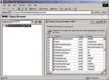 Инструментарий WMI Scripting API позволяет решать задачи, для которых не требуется использовать программы управления системами. Например, экземпляр класса Win32_ Process в WMI представляет процесс Win32, выполняющийся на рабочей станции. Как показано на Экране 6, с помощью входящей в состав SDK программы WMI Object Browser можно подключиться к пространству имен ootCIMV2, нажать кнопку Browse for Instance, выбрать Win32_Process и получить список всех процессов, выполняющихся в системе. В этом примере исследуется экземпляр notepad.exe, в правой панели показаны свойства, связанные с данным объектом, включая степень использования памяти и файла подкачки. Каждый экземпляр класса Win32_Process поддерживает четыре метода - Create, GetOwner, GetOwnerSid и Terminate.