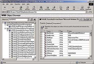 После установки WMI SDK появляются дополнительные инструменты навигации по пространству имен WMI. Это оснащенный Web-интерфейсом WMI Object Browser, который позволяет просматривать объекты и связанные с ними методы и свойства внутри пространства имен в окне с несколькими хорошо оформленными панелями. На Экране 5 в окне WMI Object Browser представлен экземпляр класса Win32_OperatingSystem, для которого определено свойство с именем SAUTERNES. В правой панели окна показаны свойства, связанные с экземпляром класса Win32_ OperatingSystem. Эти данные соответствуют конкретной установке Windows 2000 на моем компьютере.