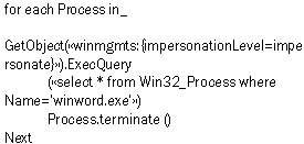 Несколько строк кода, приведенного на Рисунке 1, показывают, как можно обнаружить и прекратить работу экземпляра Microsoft Word, выполняющегося в системе. В этом коде использован цикл FOR...EACH для нумерации запущенных в системе процессов. Далее с помощью метода GetObject открывается пространство имен WMI, по умолчанию установленное в ootCIMV2, и задается уровень прав доступа. WMI использует учетную запись зарегистрированного в данный момент пользователя (или другую явно заданную учетную запись) для назначения прав доступа при выполнении запроса. При определении параметра impersonationLevel=impersonate, сценарий использует полномочия текущей учетной записи при подключении к пространству имен. Следующий далее набор команд ExecQuery («select * from Win32_Process where Name=?winword.exe?») представляет собой оператор языка WBEM Query Language. Его задача - выбрать все экземпляры класса Win32_process, у которых свойство Name равно winword.exe. Когда такой процесс будет обнаружен, выполняется метод Terminate для прекращения его работы.