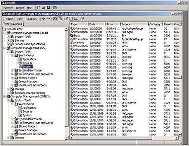 На Рисунке 6 показано диалоговое окно оснастки Computer Management из состава MMC, используемой для мониторинга трех систем: локального сервера Windows 2000, резервного контроллера домена NT 4.0 и некоторого автономного сервера NT 4.0 с именем ASPEN. Чтобы создать представленную на рисунке многооконную «картинку», при загрузке оснастки я выбрала флажок Allow the selected computer to be changed when launching from the command line («Разрешить изменения для выбранного компьютера при запуске с командной строки»), чтобы иметь возможность использовать этот инструмент для управления удаленными системами. Несмотря на то что многие функции Computer Management (дисковые квоты, дефрагментация дисков, менеджер устройств) специфичны для Windows 2000, еще остается возможность проверить, есть ли в системе разделяемые каталоги, открытые соединения, функция запуска и остановки служб на удаленной системе NT 4.0 - и все это через интерфейс MMC. При обращении к функции, которая не поддерживается системой NT, появится сообщение The connection to computername could not be established («Соединение с <имя_компьютера> не может быть установлено»).